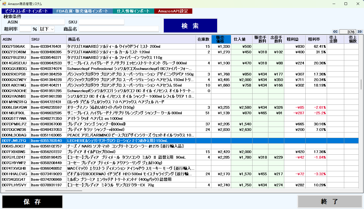 Amazonの商品販売利益確認リストです。 ASINもしくはSKUを用意しAPIを使って最安価格・手数料などを取得し仕入の価格を設定することで各商品の粗利率(利益率)や粗利額(利益金額)を算出したものがリストで表示されます。 また粗利率(利益率)を条件で指定することで利益が見込めるものだけを抽出し画面に表示するといったこともできます。 APIを利用することで在庫の変更や販売価格の変更などの連携を行うことも可能です。